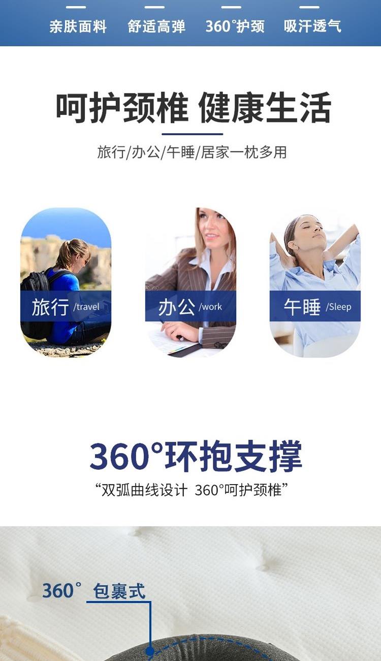 規(guī)格:31*31*8cm 面料:錦綸+滌綸 填充:聚氨酯 重量:290g 賣點: 1、360°全貼合,“工學(xué)設(shè)計”,加高貼合下顎設(shè)計,均勻分散壓力。 2、夠輕不壓頸,柔中有韌,舒緩解壓。 3、便攜收納,適合多種場景。