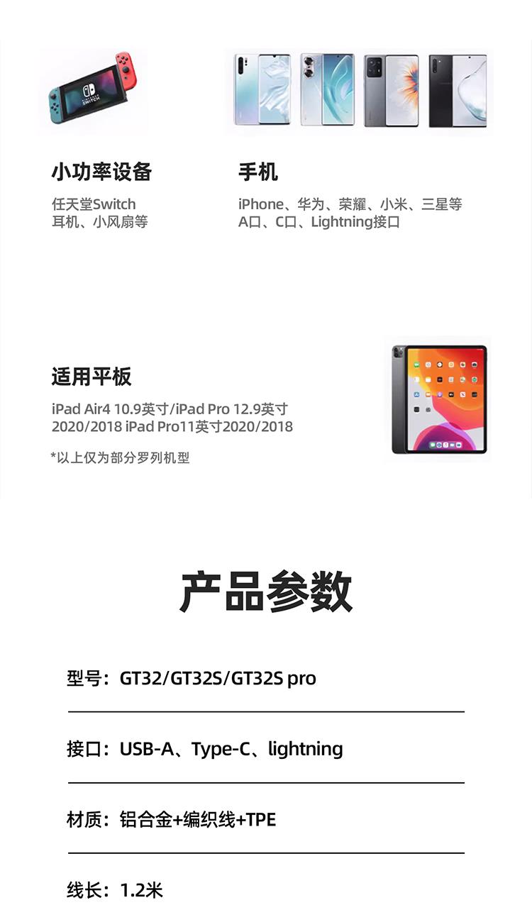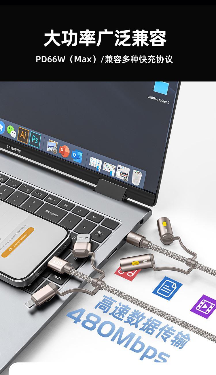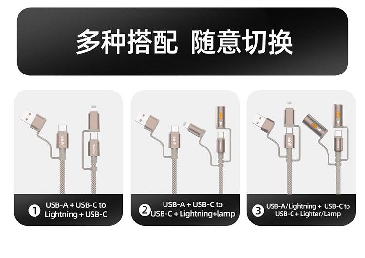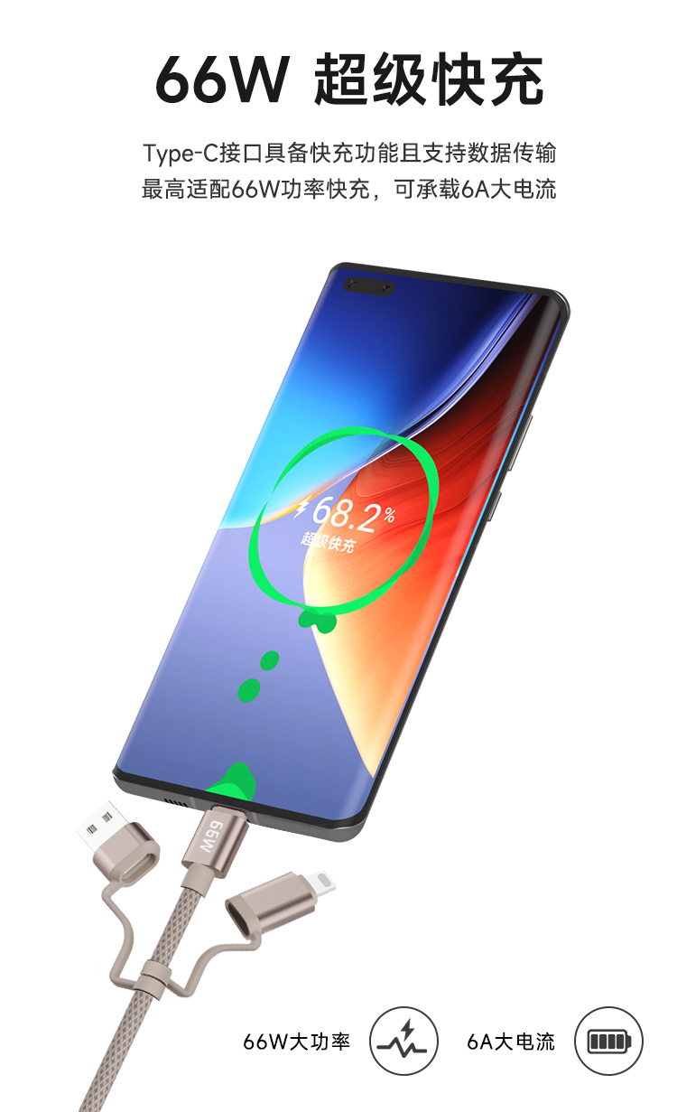 接口:USB-A、Type-C、lightning 材質(zhì):鋁合金+編織線+TPE 線長:1.2米 功能:快充、數(shù)據(jù)傳輸 電流:5A 功率:66W (Max) 一線多用 高效便攜,自由切換 隨意組合,數(shù)據(jù)線一條就夠 仿硅膠雙色織線,高密度編織線身,耐磨耐彎不打結(jié) 加粗鍍錫銅芯,安全快充更護(hù)機(jī) 66W超級快充 多接口輕松應(yīng)對,大功率廣泛兼容