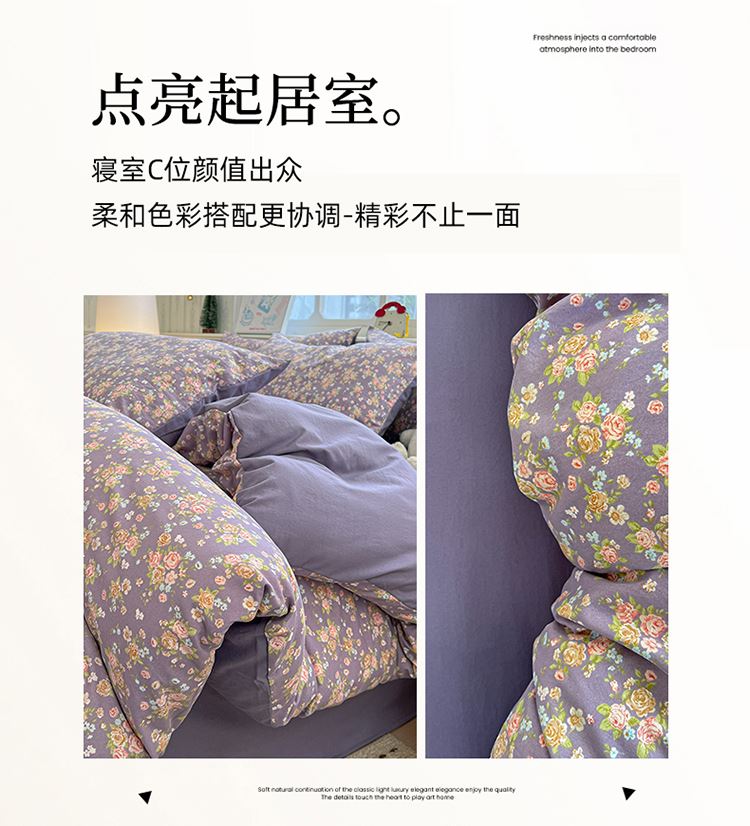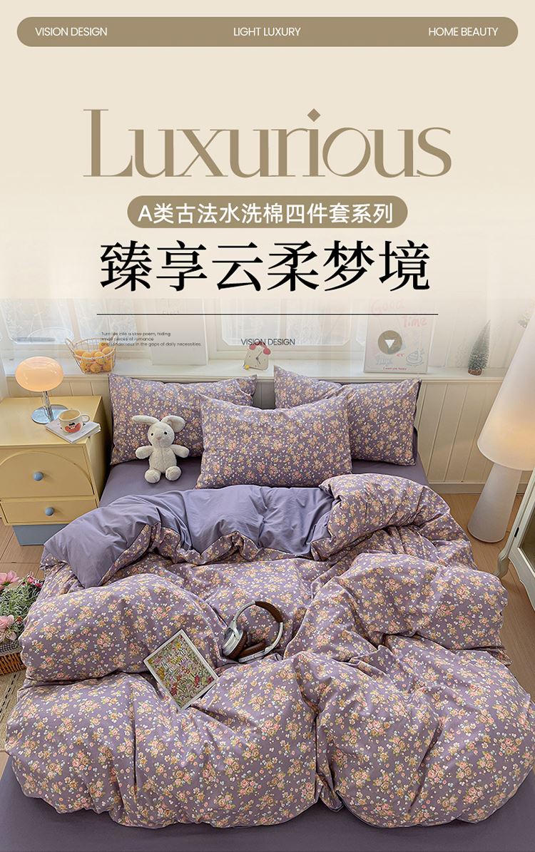 1:古法水洗棉四件套系列 臻享云柔夢境 2:水洗棉面料溫柔軟糯觸感 水洗棉面料 舒適柔軟 瑩潤寵溺倍享寵愛 帶來甜美舒適的睡眠享受 3:A面印花搭配B面純色設(shè)計,視覺層次感強,優(yōu)雅精致大氣,久看不膩高顏值,臥室更有品質(zhì)感。 尺寸:被套200*230cm 床單:230*250cm 枕套:48*74cm*2 包裝:彩盒