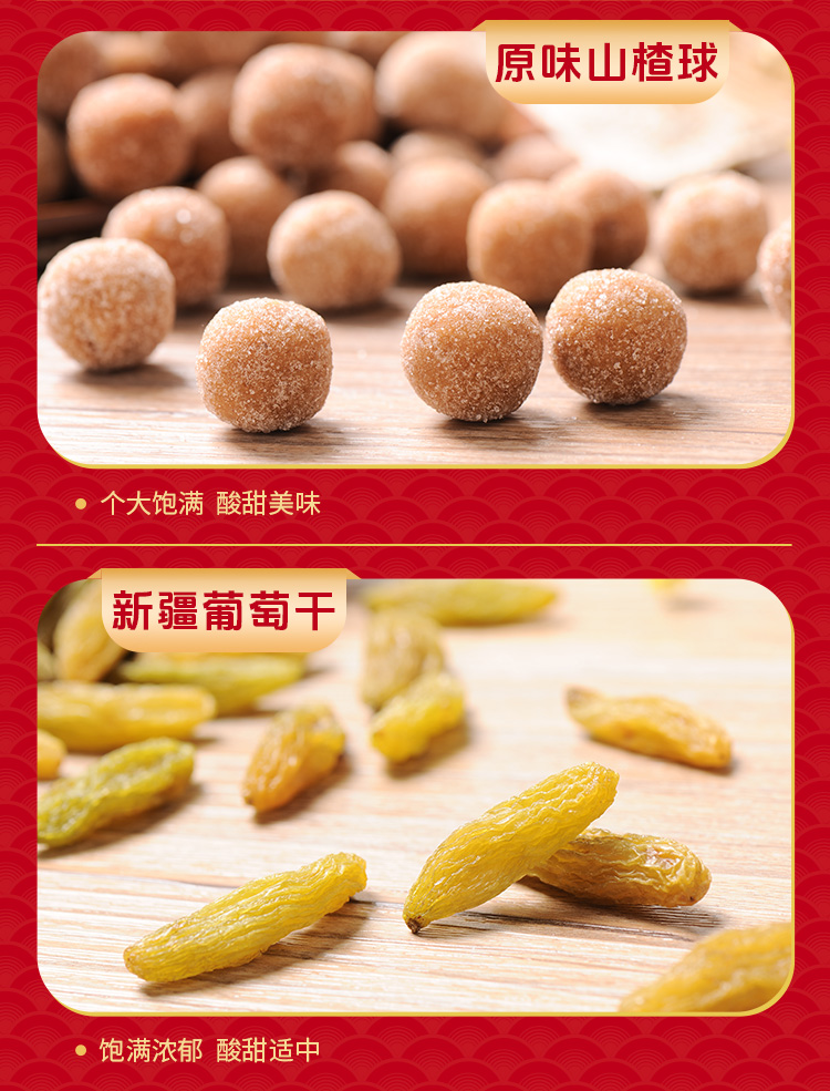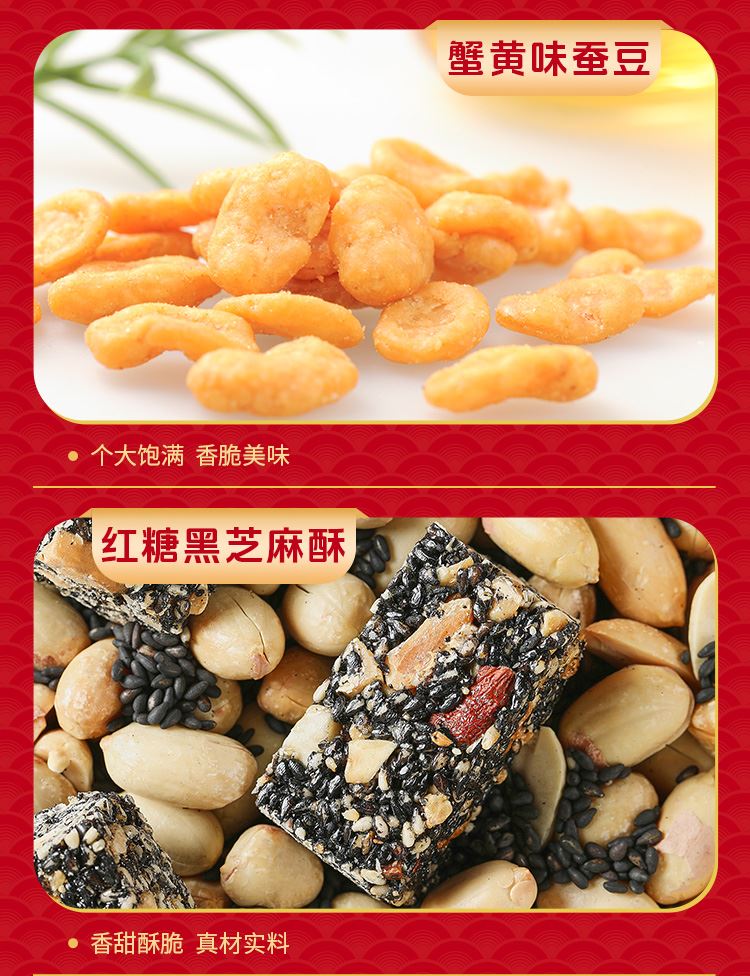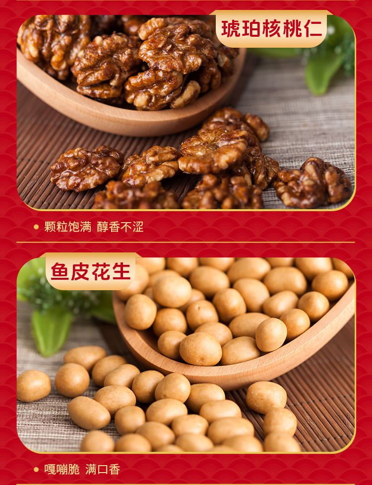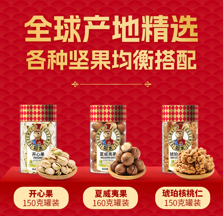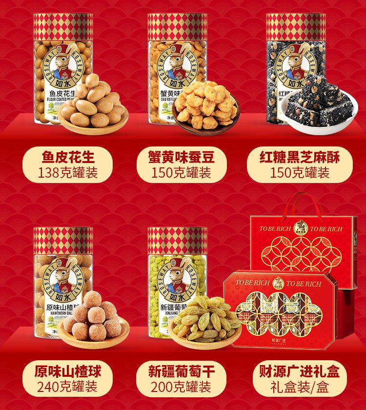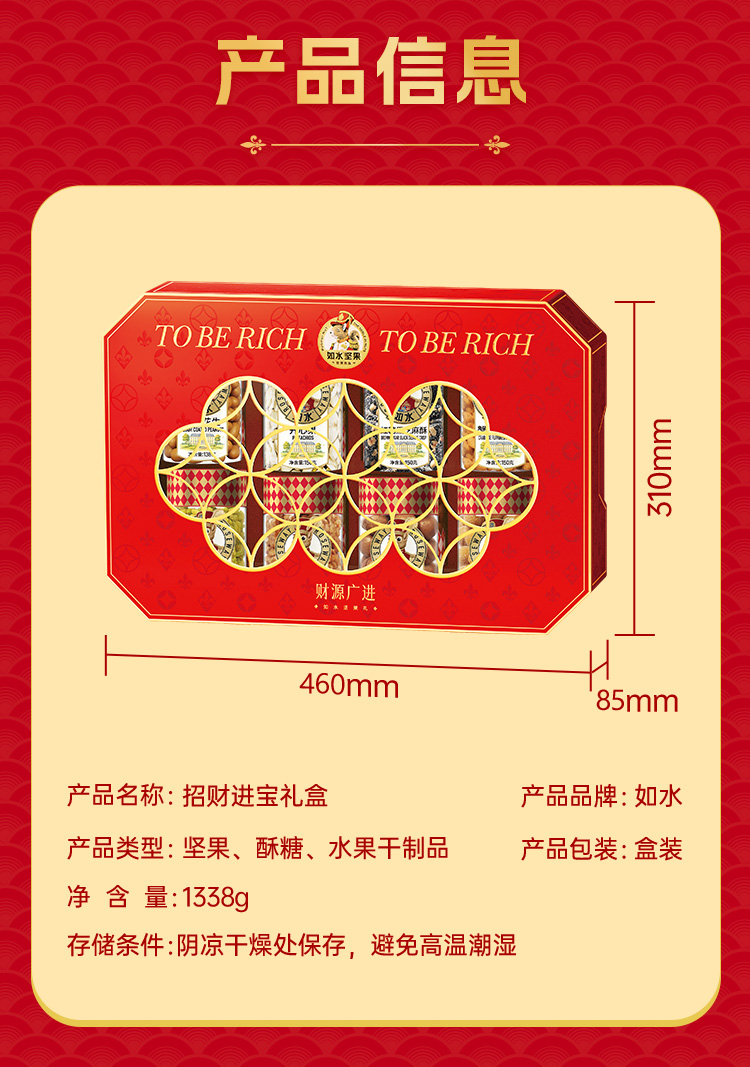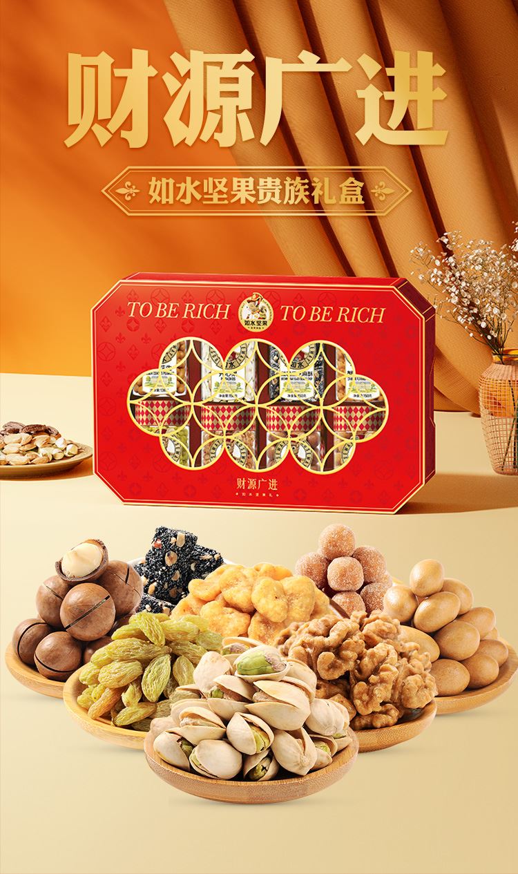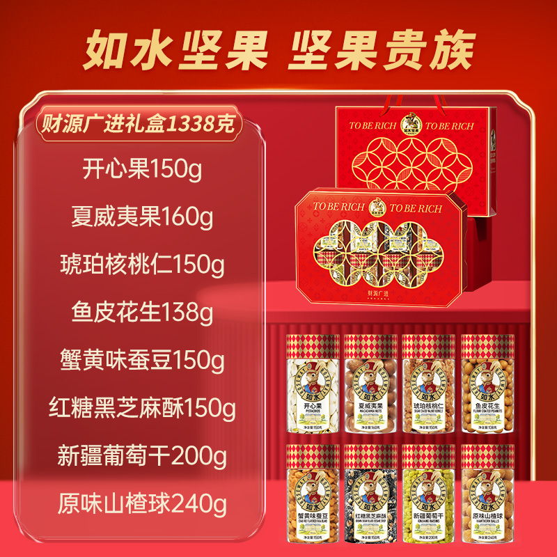 如水財(cái)源廣進(jìn)禮盒 凈含量:1338g 如水開心果150g 如水夏威夷果160g 如水琥珀核桃仁150g 如水魚皮花生138g 如水蟹黃味蠶豆150g 如水紅糖黑芝麻酥150g 如水新疆葡萄干200g 如水原味山楂球240g