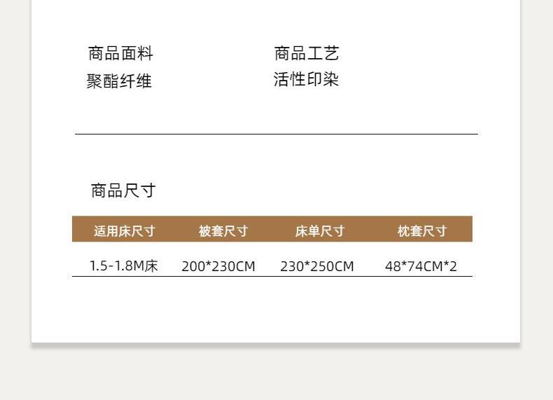 產(chǎn)品規(guī)格:被套200*230cm 床單 230*250cm 枕套48*74cm*2 面料材質(zhì):聚酯纖維 凈 重:2.8kg 禮盒 尺寸:420*320*95mm