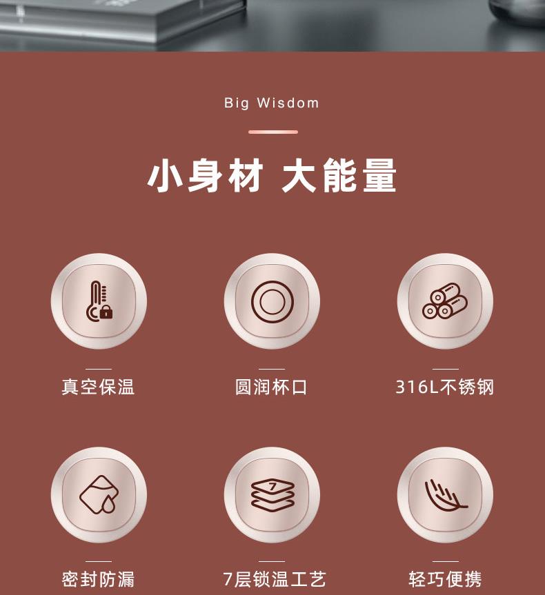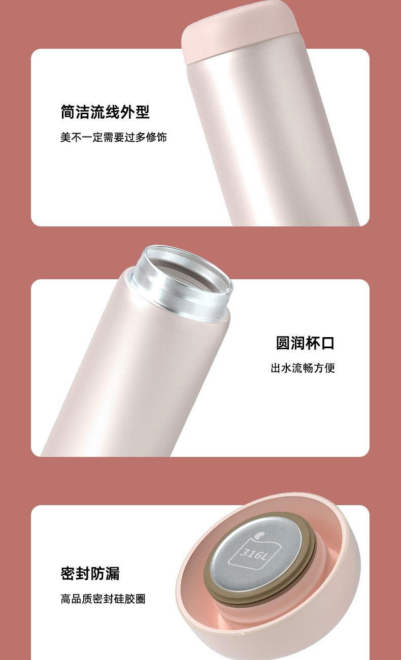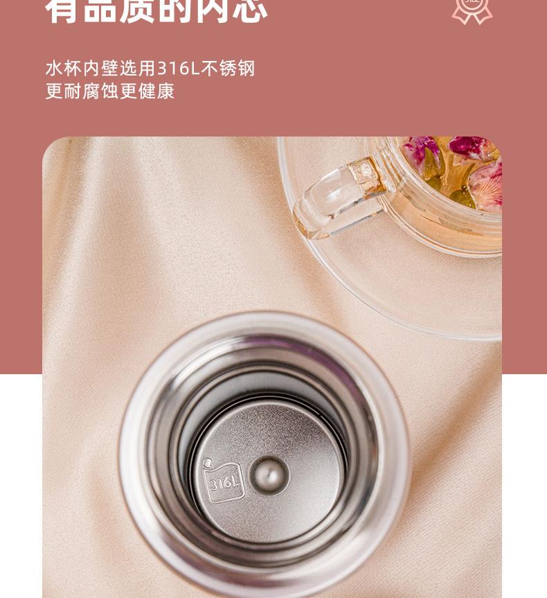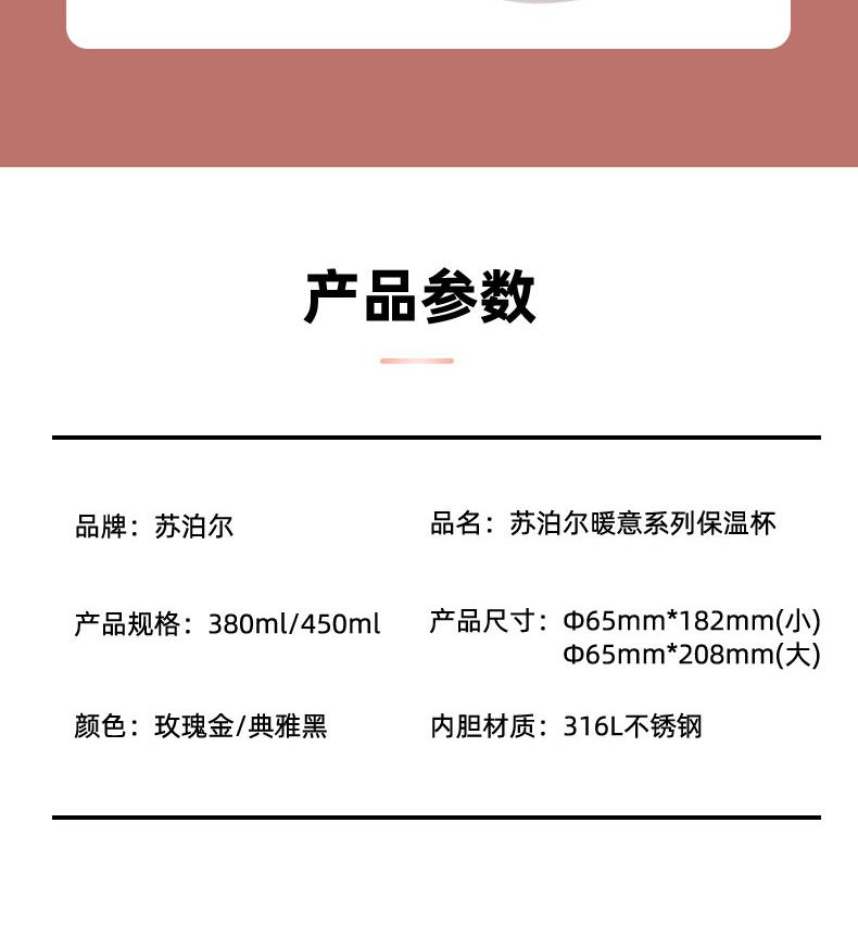 規(guī)格參數(shù) 產(chǎn)品說明 顏色:典雅黑 容量:380ml 材質(zhì):316L不銹鋼 商品69碼:6950885590124 黑 功能賣點 1、316L不銹鋼,耐磨耐用耐腐蝕 2、雙層真空,隔絕溫度流失 3、長效保溫,保溫保冷 4、密封設(shè)計,倒置不漏