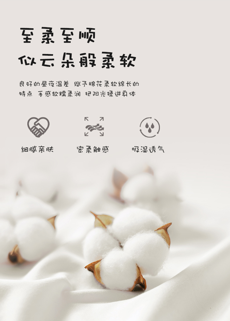 2:至柔至順?biāo)圃贫浒闳彳?良好的晝夜溫差 賦予棉花柔軟綿長(zhǎng)的特點(diǎn) 手感軟糯柔潤(rùn) 把陽(yáng)光操進(jìn)身體