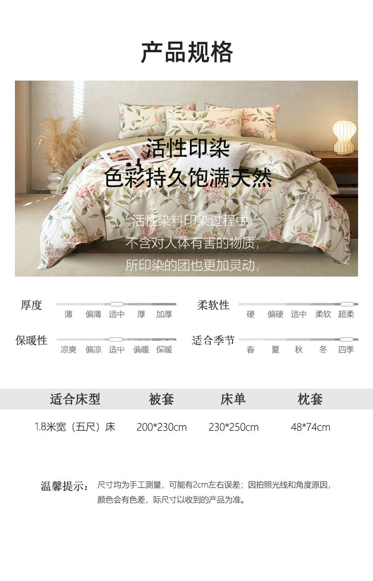 產(chǎn)品編碼:JLY25601 產(chǎn)品規(guī)格:被套200*230cm 床單 235*245cm 枕套48*74cm*2 面料材質(zhì):棉 凈 重:2.9kg 禮盒 尺寸:420*320*95mm
