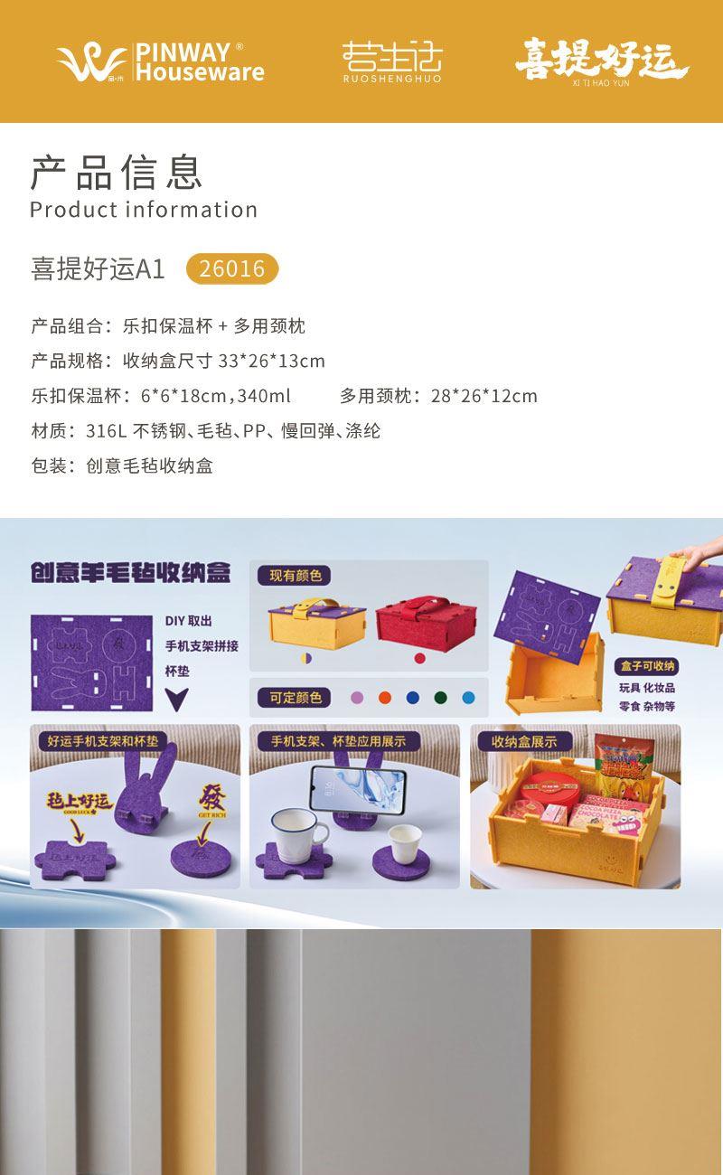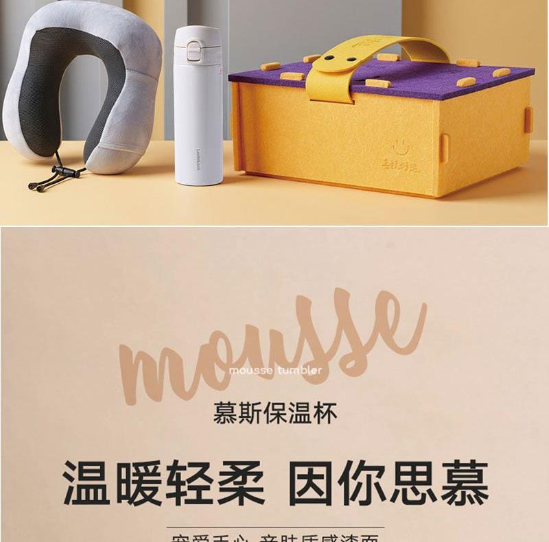 產(chǎn)品組合:樂扣保溫杯+多用頸枕 產(chǎn)品規(guī)格:收納盒尺寸33*26*13cm 樂扣保溫杯:6*6*18cm,340ml 多用頸枕:28*26*12cm 材質(zhì):316L不銹鋼、毛氈、PP、 慢回彈、滌綸 包裝:創(chuàng)意毛氈收納盒