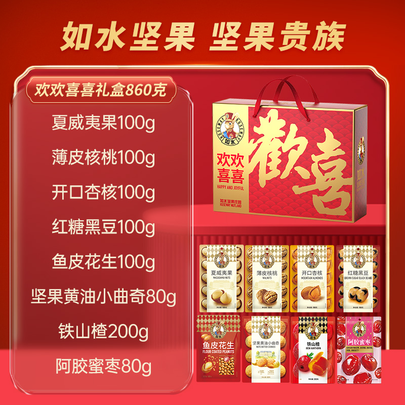 如水歡歡喜喜禮盒 凈含量:860g 如水夏威夷果100g 如水薄皮核桃100g 如水開口杏核100g 如水紅糖黑豆100g 如水魚皮花生100g 如水堅(jiān)果黃油小曲奇80g 如水鐵山楂200g 如水阿膠蜜棗80g