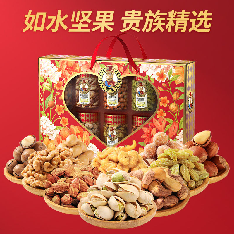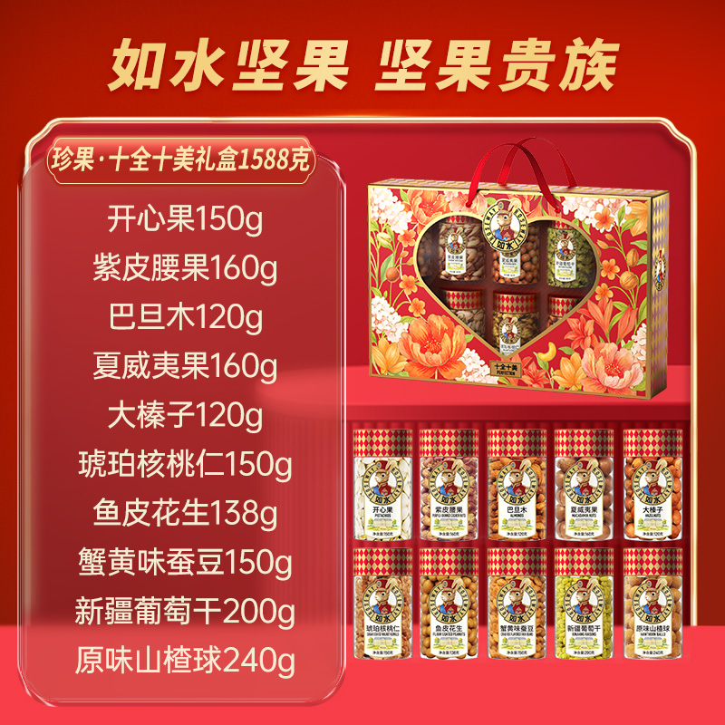 如水珍果·十全十美禮盒 凈含量:1588g 如水開(kāi)心果150g 如水紫皮腰果160g 如水巴旦木120g 如水夏威夷果160g 如水大榛子120g 如水琥珀核桃仁150g 如水魚(yú)皮花生138g 如水蟹黃味蠶豆150g 如水新疆葡萄干200g 如水原味山楂球240g