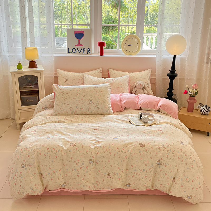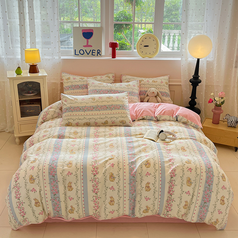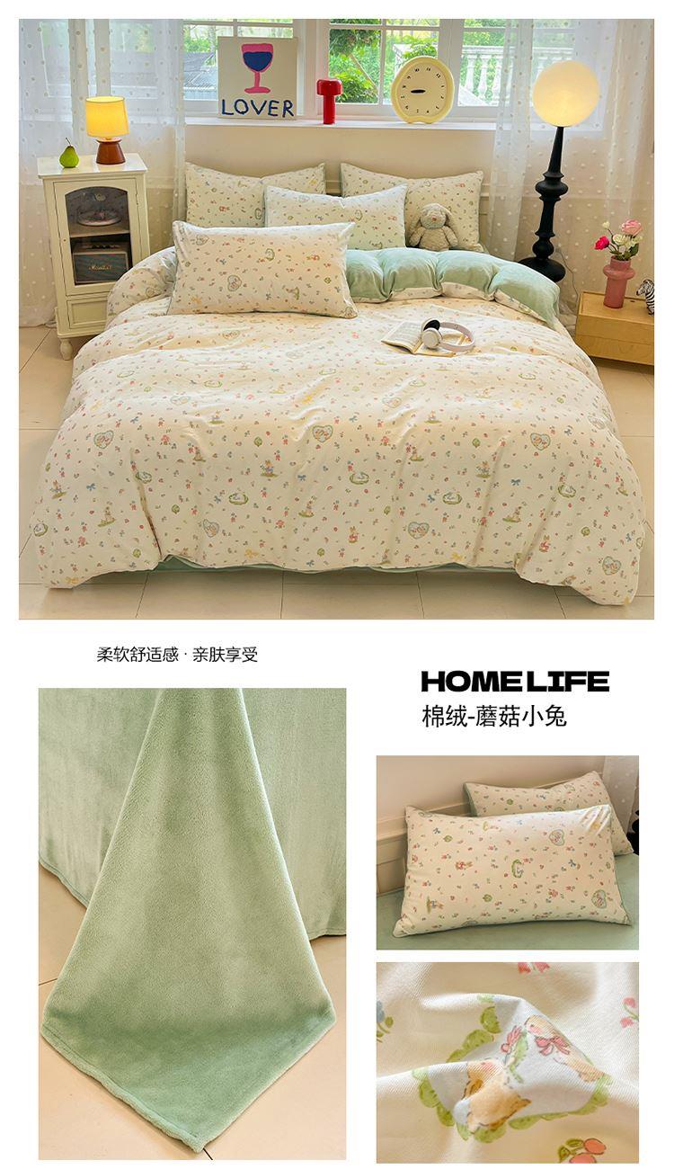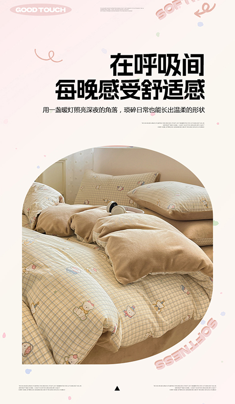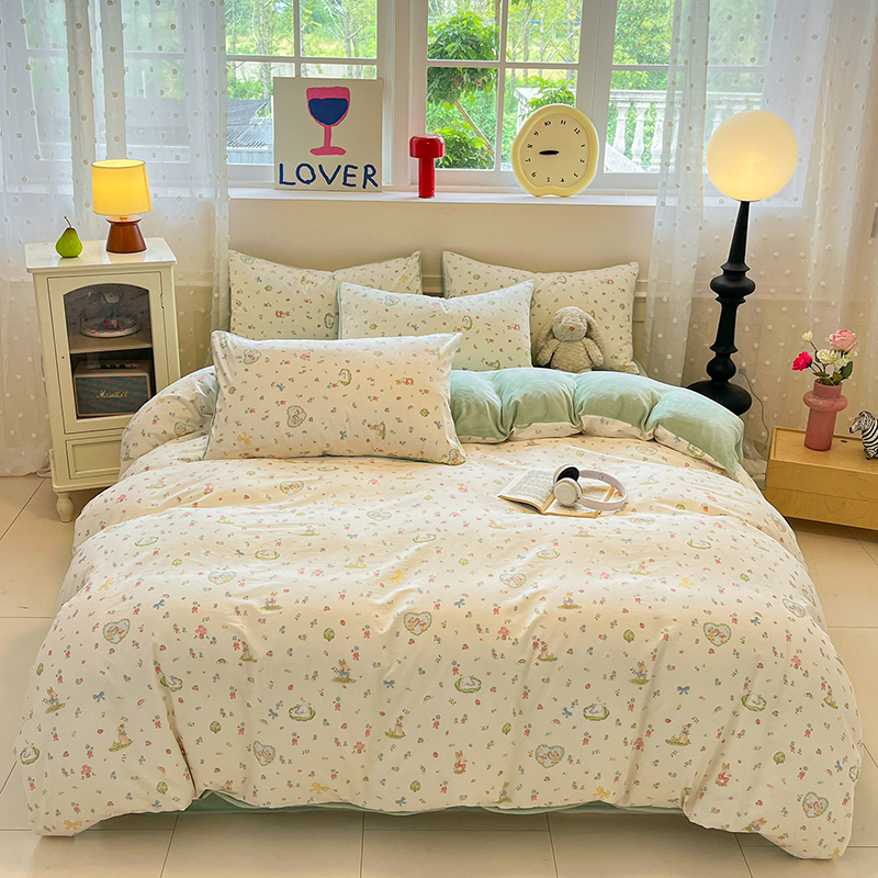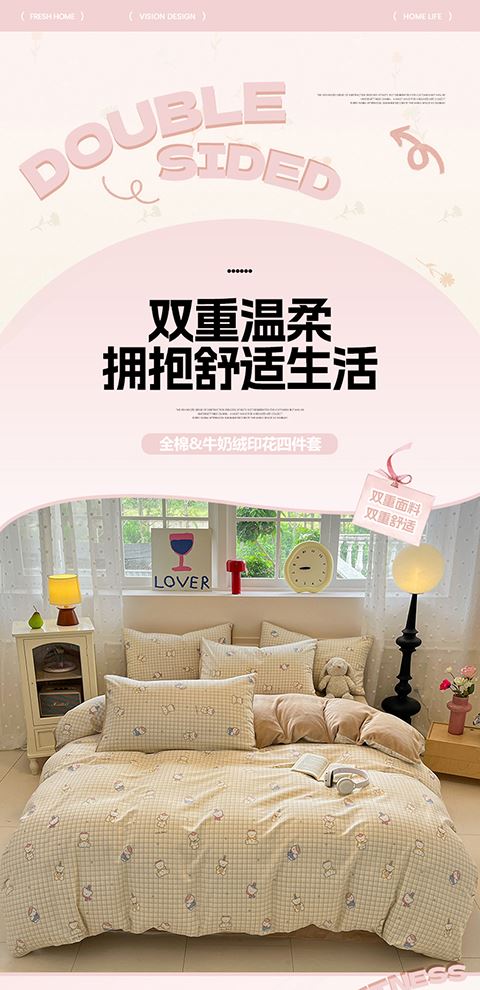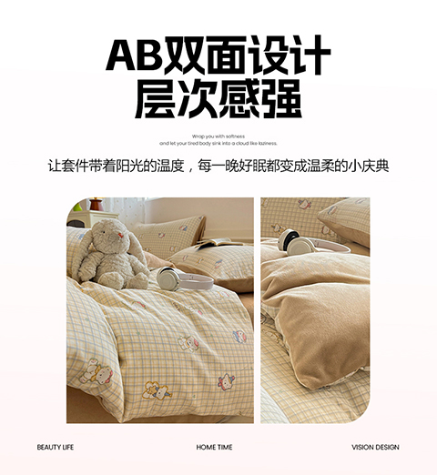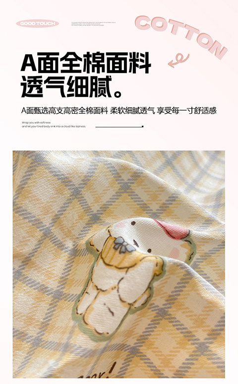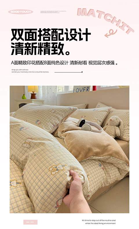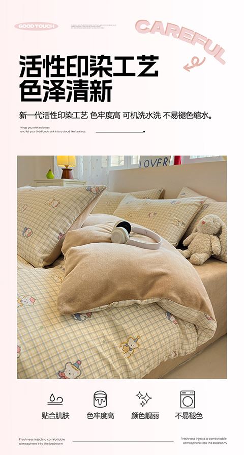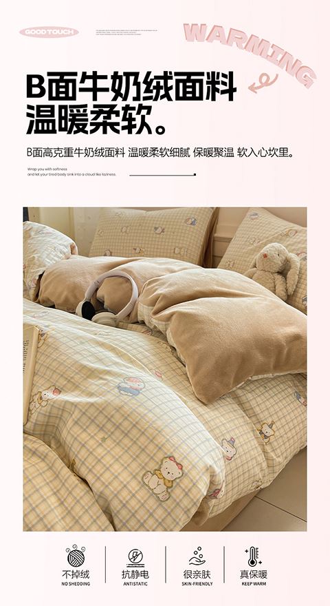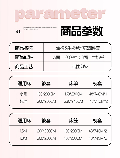 1:A面甄選高支高密全棉面料 柔軟細(xì)膩透氣 享受每一寸舒適感 2:B面高克重牛奶絨面料 溫暖柔軟細(xì)膩 保暖聚溫 軟入心坎里 3:雙面搭配設(shè)計清新精致。 A面精致印花搭配B面純色設(shè)計 清新耐看 視覺層次感強 。 尺寸:被套:200*230cm*1 床單:230*245cm*1 枕套:48*74cm*2 包裝:禮盒/禮袋 重量:約3kg