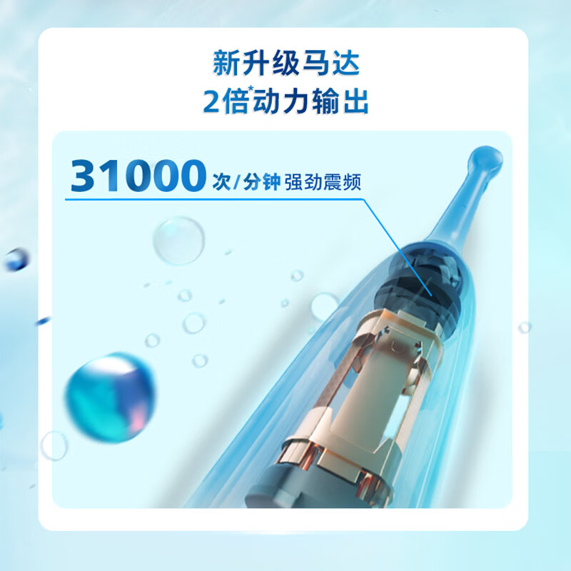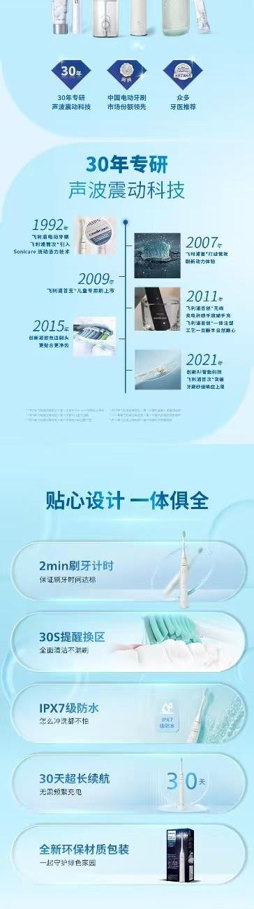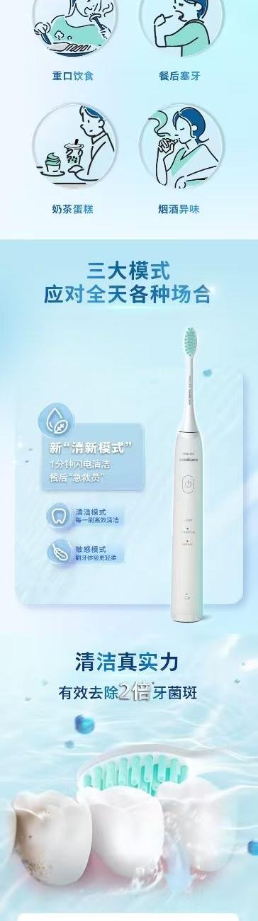 ? 磁懸浮脈沖馬達 震動頻率高達 31,000 次/分鐘 ? 3種模式 (清潔 、敏感、清新)更有助于清潔2倍牙菌斑 ? 10小時充滿電 續(xù)航時間30天 IPX7級防水、 USB充電底座 、自帶2個刷頭 ? 清潔模式提供出色日常清潔,而敏感模式則用于輕柔清潔牙齒和牙齦。 ? 弧形刷毛貼合您的牙齒形狀,讓您可以輕松、輕柔地清潔難以觸及的區(qū)域