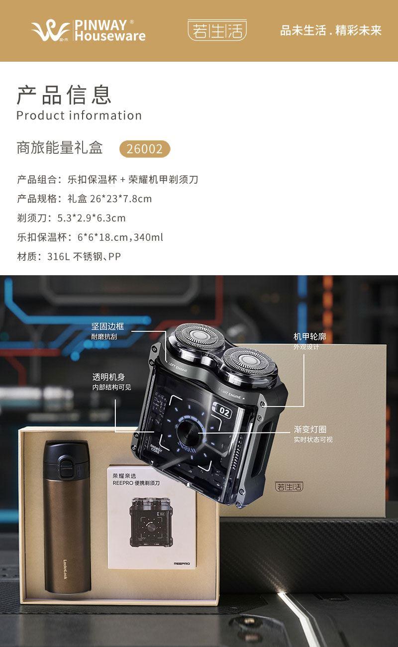 產(chǎn)品組合:樂扣保溫杯+榮耀機甲剃須刀 產(chǎn)品規(guī)格:禮盒26*23*7.8cm 剃須刀:5.3*2.9*6.3cm 樂扣保溫杯:6*6*18.cm,340ml 材質(zhì):316L不銹鋼、PP 包裝:精裝禮盒