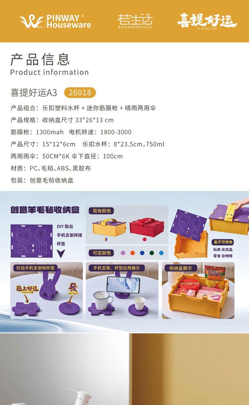 產(chǎn)品組合:樂(lè)扣塑料水杯+迷你筋膜槍 +晴雨兩用傘 產(chǎn)品規(guī)格:收納盒尺寸33*26*13 cm 筋膜槍:1300mah 電機(jī)轉(zhuǎn)速:1800-3000 產(chǎn)品尺寸:15*12*6cm 樂(lè)扣水杯:8*23.5cm,750ml 兩用雨傘: 50CM*6K 傘下直徑:100cm 材質(zhì):PC、毛氈、ABS、黑膠布 包裝:創(chuàng)意毛氈收納盒