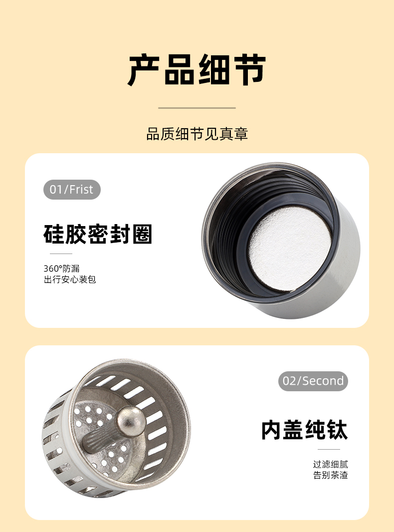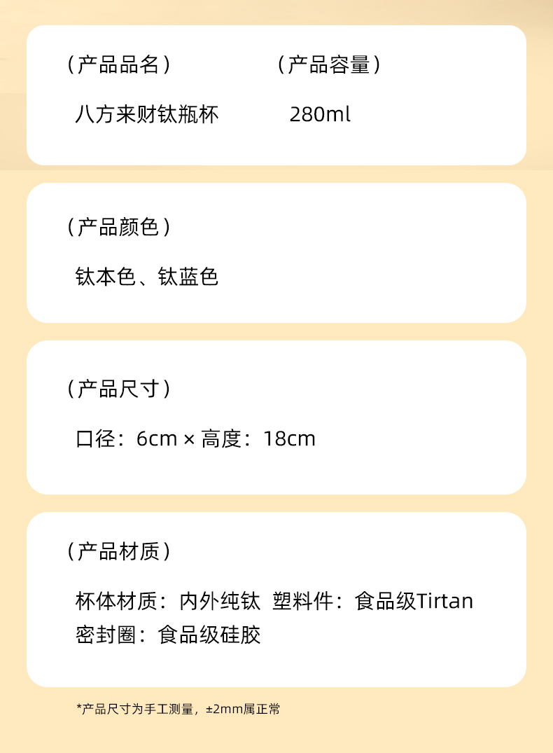 · 杯體采用純鈦材質(zhì),含鈦量達(dá)99.8%。