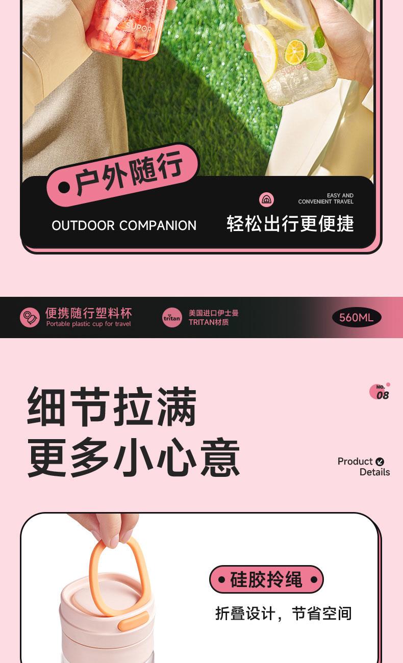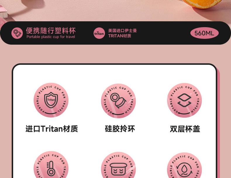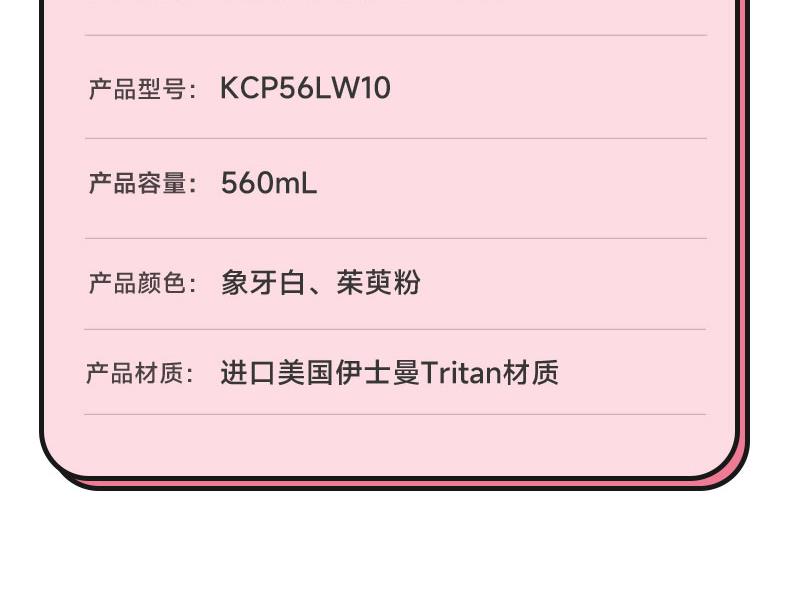 容量 560ml 材質 Tritan 規(guī)格參數(shù) 產(chǎn)品說明 顏色:茱萸粉/象牙白 外箱尺寸(mm):490*327*417mm 毛重(kg):10.99kg
