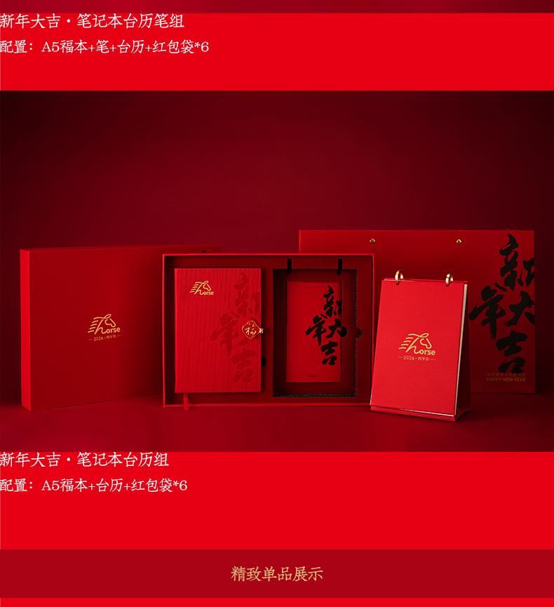 配置:A5福本+筆+臺(tái)歷+紅包袋*6 材質(zhì):五金+特種紙+PU 尺寸:福本145*215mm 筆12.5*138mm 紅包袋95*175mm 臺(tái)歷臺(tái)歷140*235mm 包裝:禮盒(358*262*53mm)+手提袋