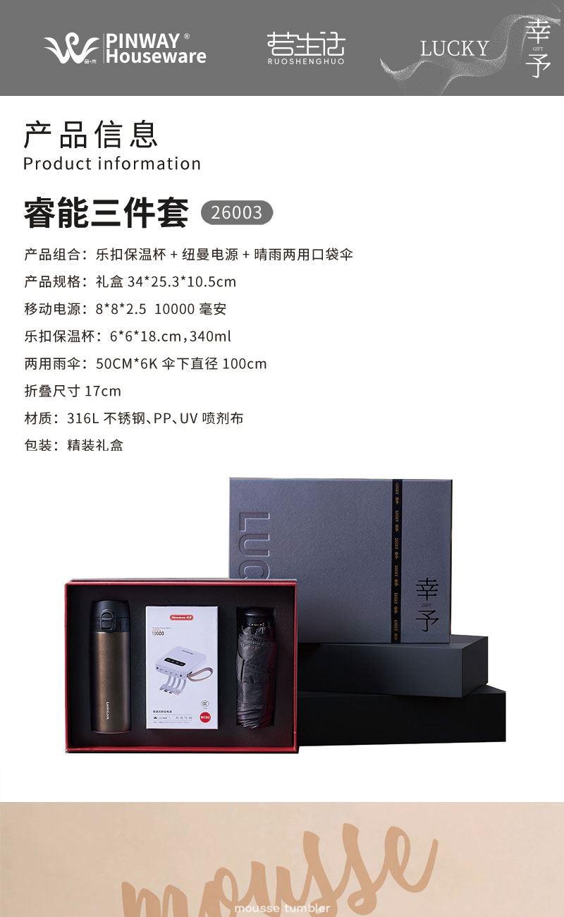 產(chǎn)品組合:樂(lè)扣保溫杯+紐曼電源+晴雨兩用口袋傘 產(chǎn)品規(guī)格:禮盒34*25.3*10.5cm 移動(dòng)電源:8*8*2.5 10000毫安 樂(lè)扣保溫杯:6*6*18.cm,340ml 兩用雨傘: 50CM*6K 傘下直徑100cm 折疊尺寸17cm 材質(zhì):316L不銹鋼、PP、UV噴劑布 包裝:精裝禮盒