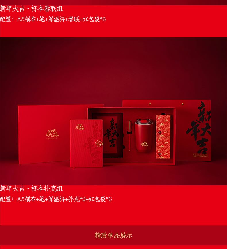 配置:A5福本+筆+保溫杯+春聯(lián)+紅包袋*6 材質(zhì):五金+特級(jí)白芯+PU+不銹鋼 尺寸:福本145*215mm 筆12.5*138mm 保溫杯380ml 紅包袋95*175mm 春聯(lián)210*1180mm 包裝:禮盒(400*268*95mm)+手提袋