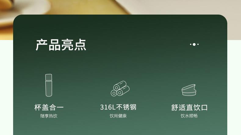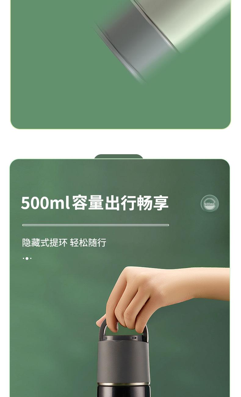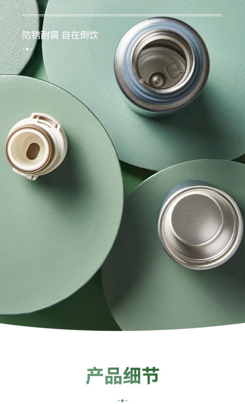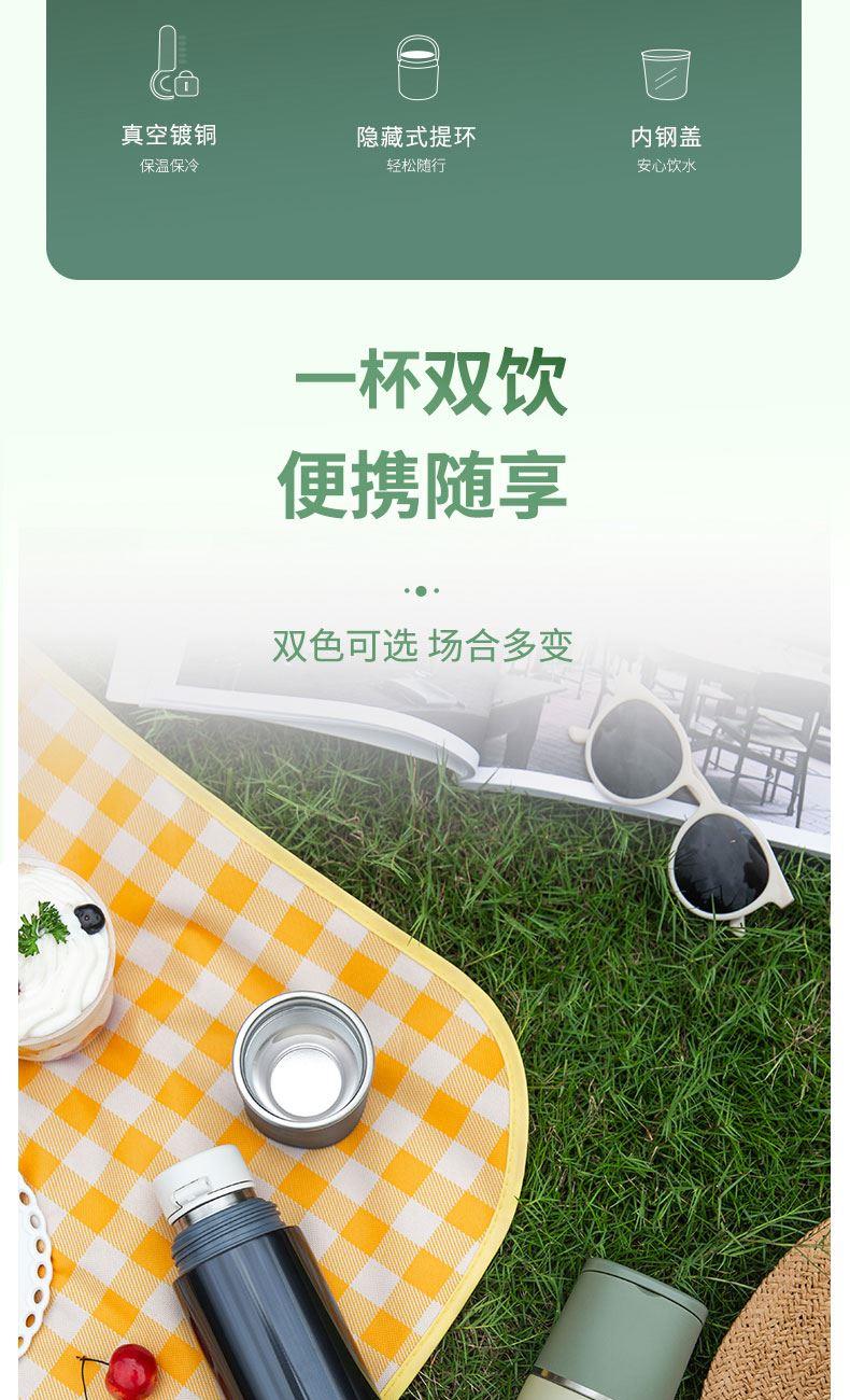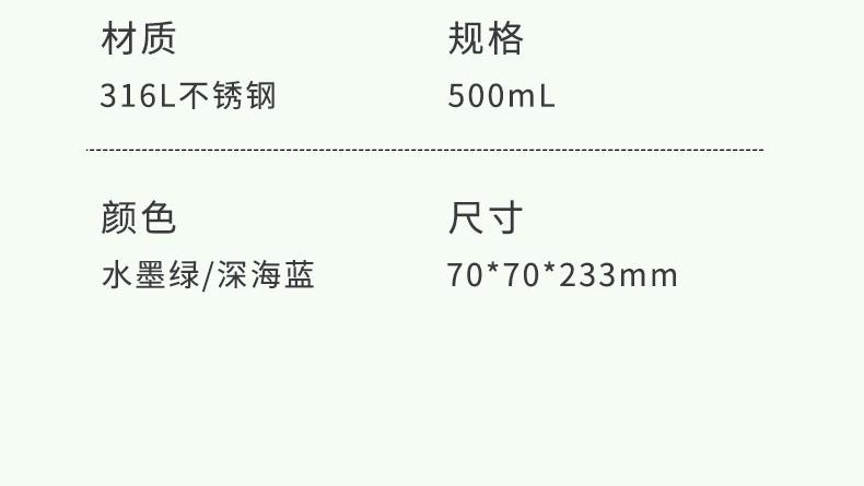 容量 500ml 材質(zhì) 316L不銹鋼、硅橡膠 規(guī)格參數(shù) 代發(fā)在庫顏色:深海藍(lán)/水墨綠 商品毛重(kg):0.529 功能賣點(diǎn) 1、316L不銹鋼內(nèi)膽及內(nèi)蓋,飲用健康; 2、一杯雙飲,杯蓋合一,隨享熱飲; 3、舒適直飲口,飲水順暢; 4、真空鍍銅,保溫保冷; 5、隱藏式提環(huán),輕松隨行; 6、內(nèi)鋼蓋,安心飲水。