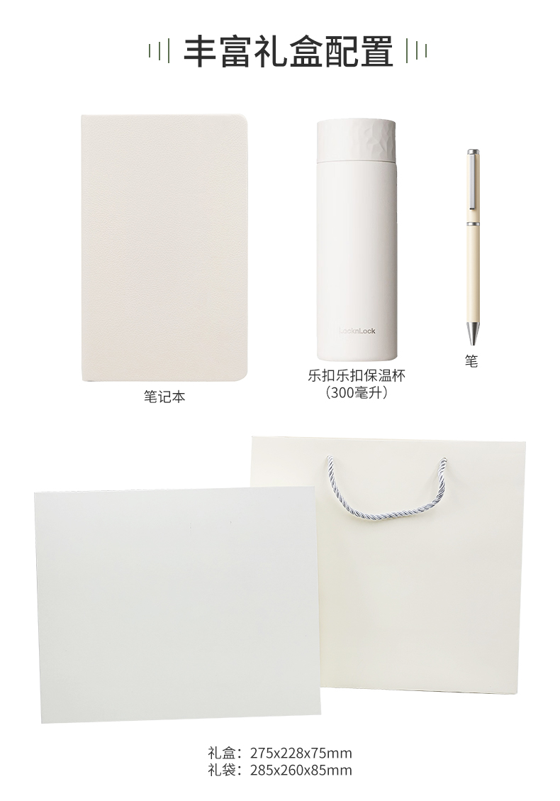 A6硬皮PU筆記本 金屬烤漆筆 LOCK&LOCK保溫杯 316內(nèi)膽 300ml 包裝盒尺寸:275x227x75mm 手提袋尺寸:286x260x85mm 顏色:米白色 重量:25kg