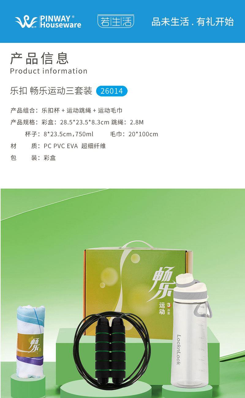 產(chǎn)品組合:樂(lè)扣杯+運(yùn)動(dòng)跳繩+運(yùn)動(dòng)毛巾 產(chǎn)品規(guī)格:彩盒28.5*23.5*8.3cm 杯子:8*23.5cm,750ml 毛巾:20*100cm 跳繩:2.8M 材質(zhì):PC PVC EVA 超細(xì)纖維 包裝:彩盒