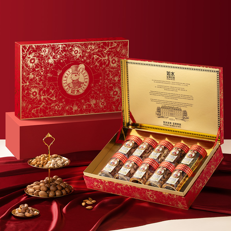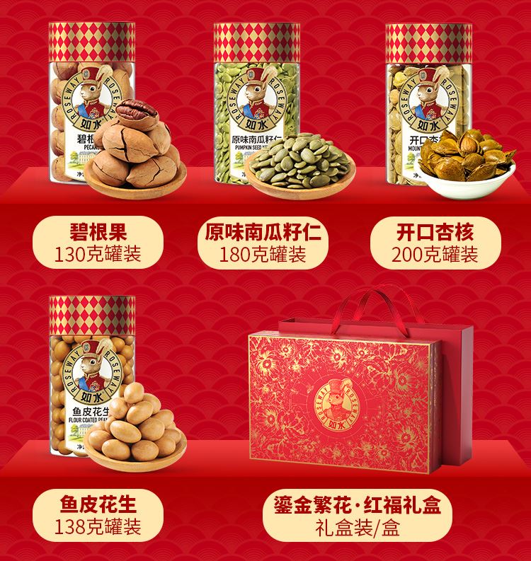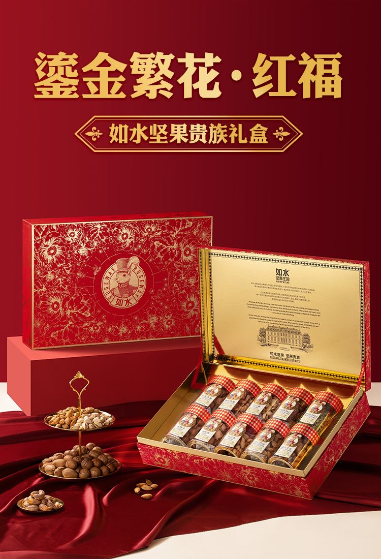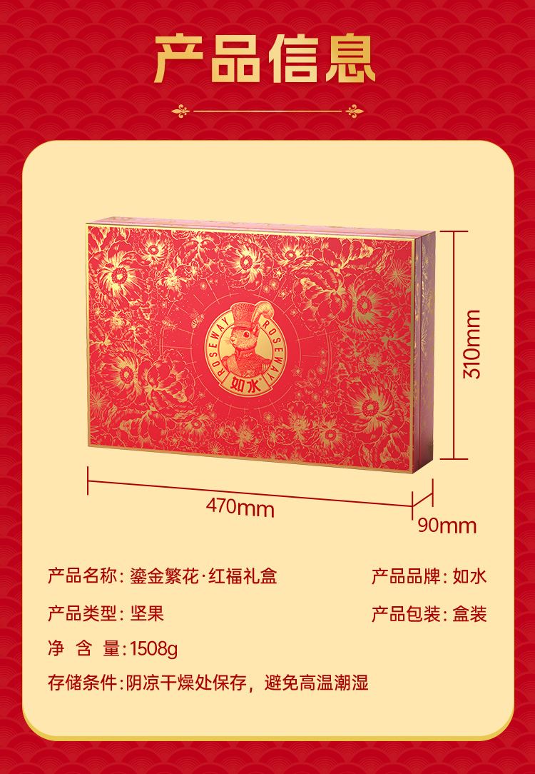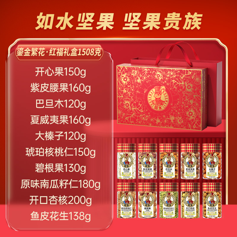 如水鎏金繁花·紅福禮盒 凈含量:1508g 如水開心果150g 如水紫皮腰果160g 如水巴旦木120g 如水夏威夷果160g 如水大榛子120g 如水琥珀核桃仁150g 如水碧根果130g 如水原味南瓜籽仁180g 如水開口杏核200g 如水魚皮花生138g