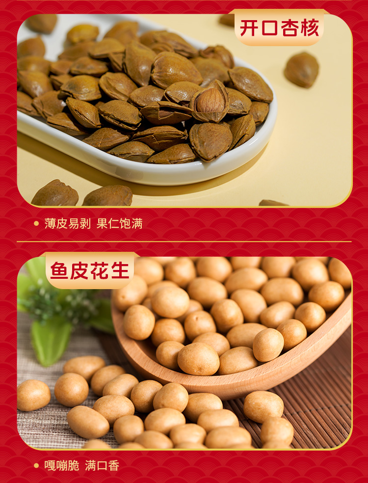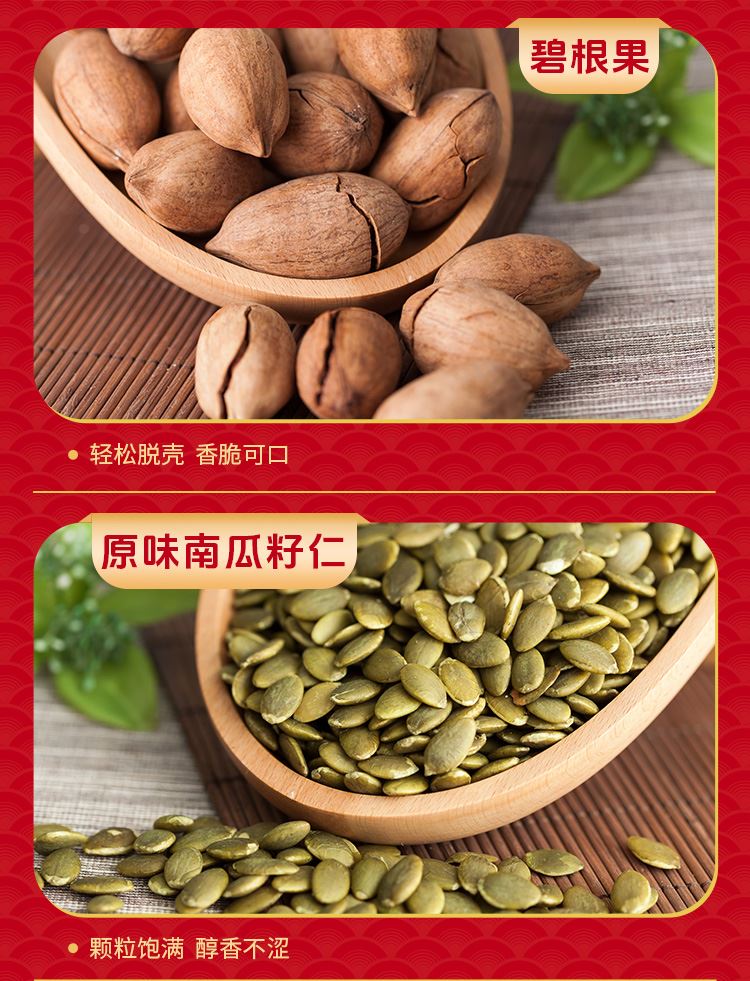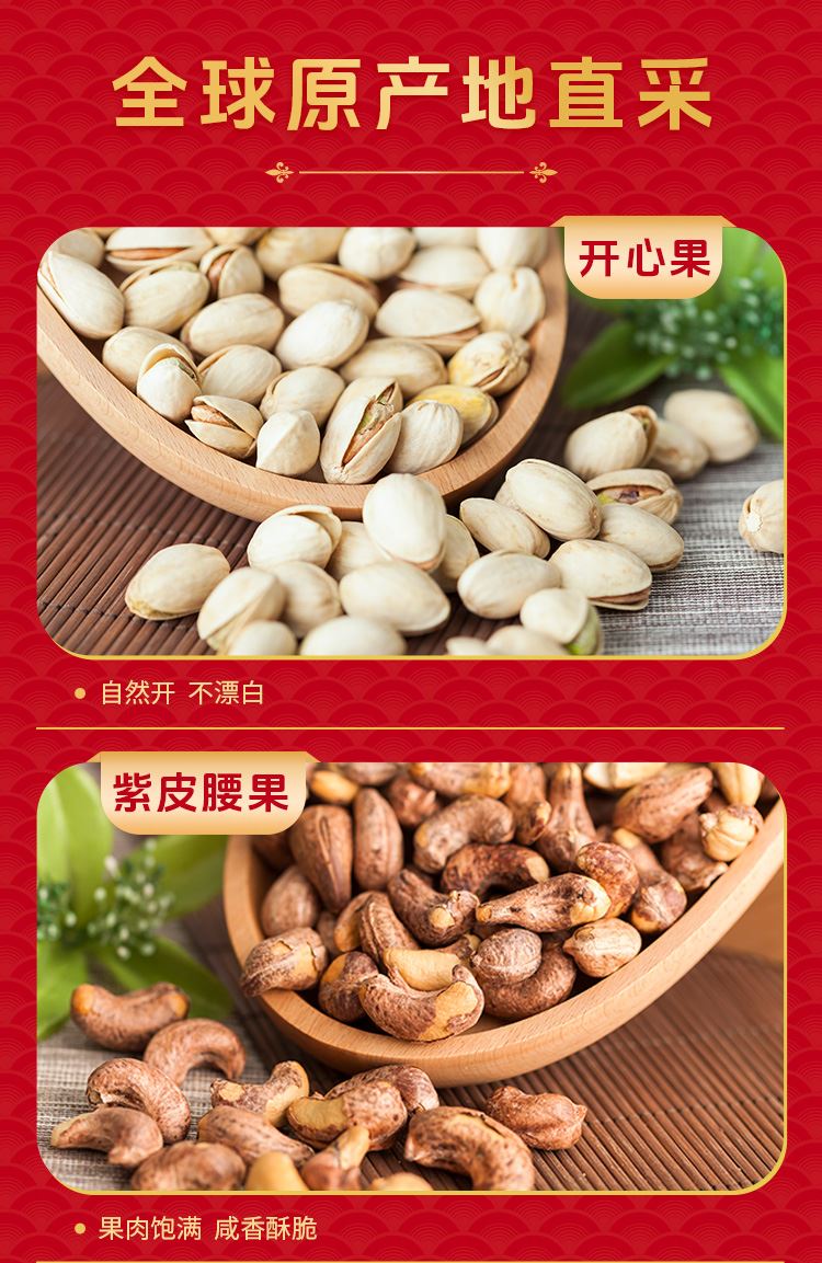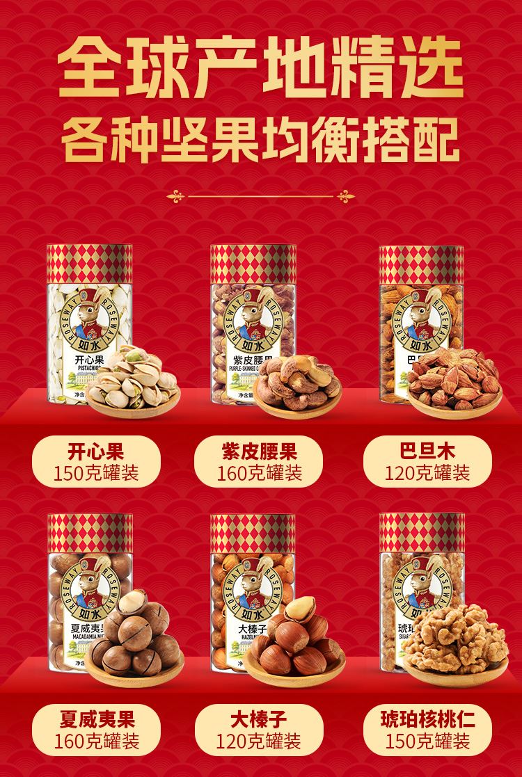 如水鎏金繁花·紅福禮盒 凈含量:1508g 如水開心果150g 如水紫皮腰果160g 如水巴旦木120g 如水夏威夷果160g 如水大榛子120g 如水琥珀核桃仁150g 如水碧根果130g 如水原味南瓜籽仁180g 如水開口杏核200g 如水魚皮花生138g