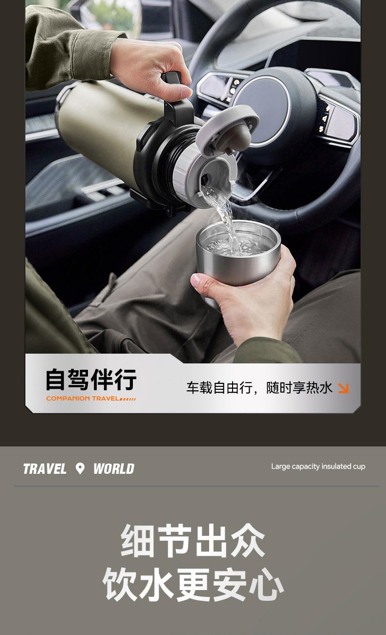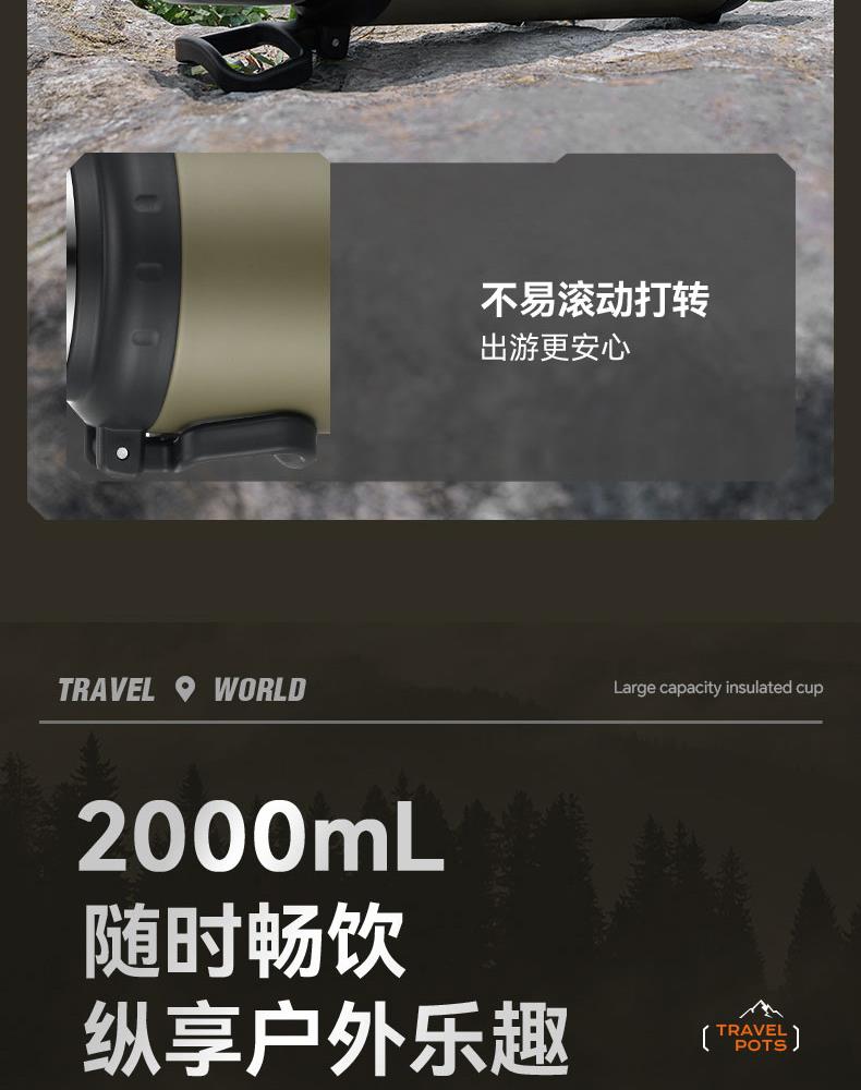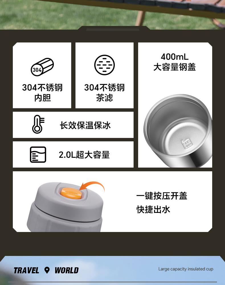 容量(L) 2.0L 材質(zhì) 內(nèi)膽304不銹鋼 規(guī)格參數(shù) 代發(fā)在庫顏色:高山綠/漫暮黑 商品毛重(kg):0.85 572*286*365 功能賣點 1、2L大容量,旅行、居家好幫手; 2、雙層鋼蓋,熱水入杯不燙手,飲用更安心; 3、強效保冷140小時+;保溫24小時+; 4、一杯雙用(直飲、杯蓋);
