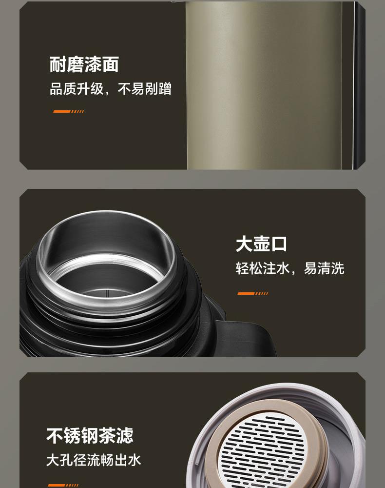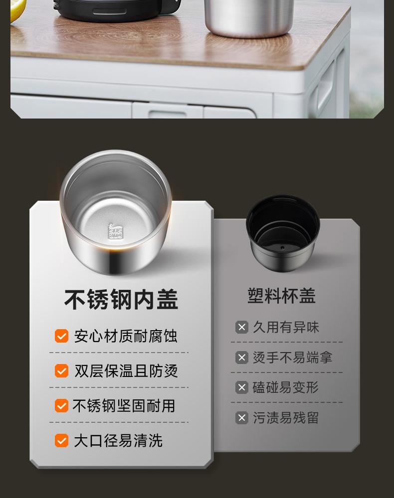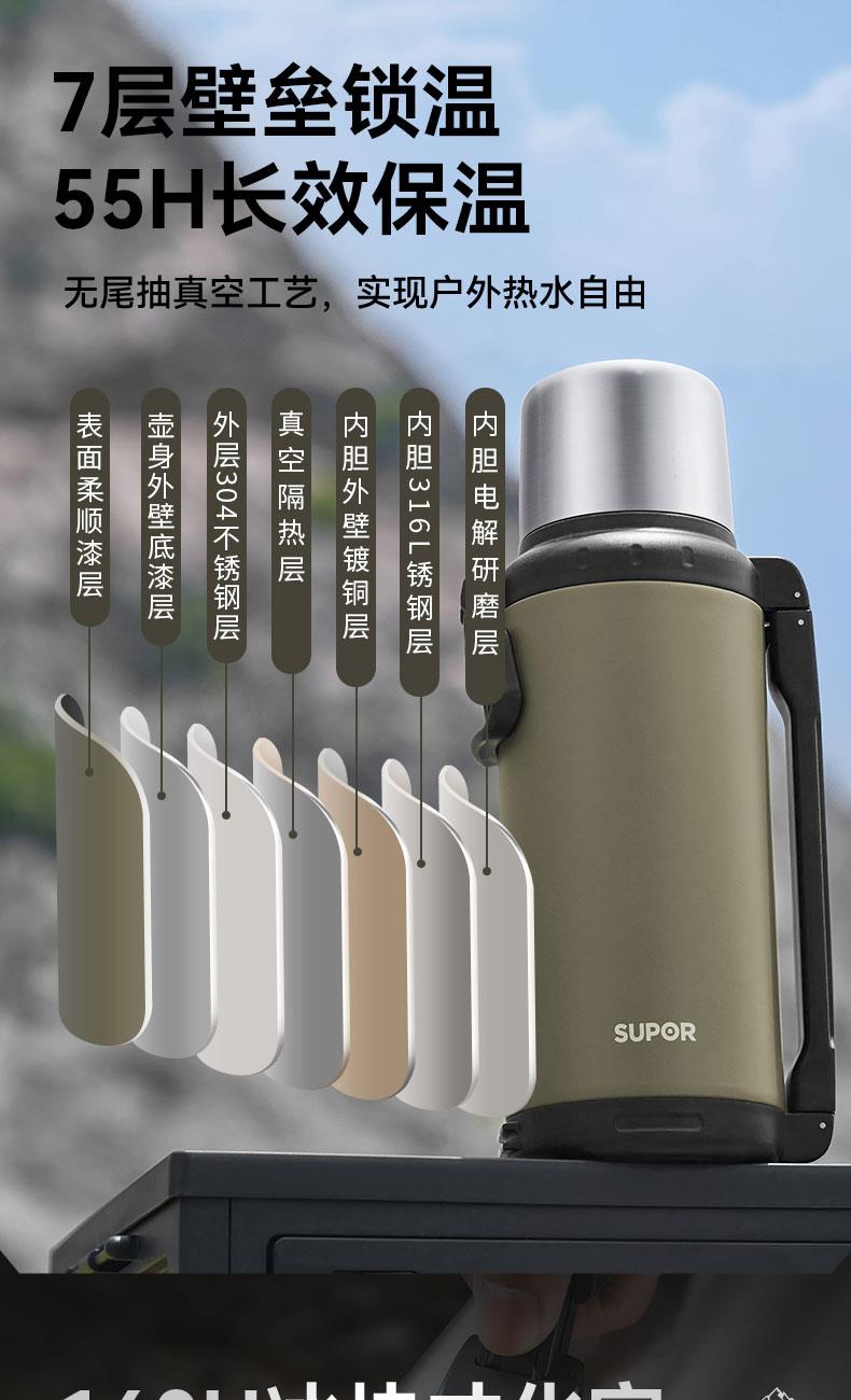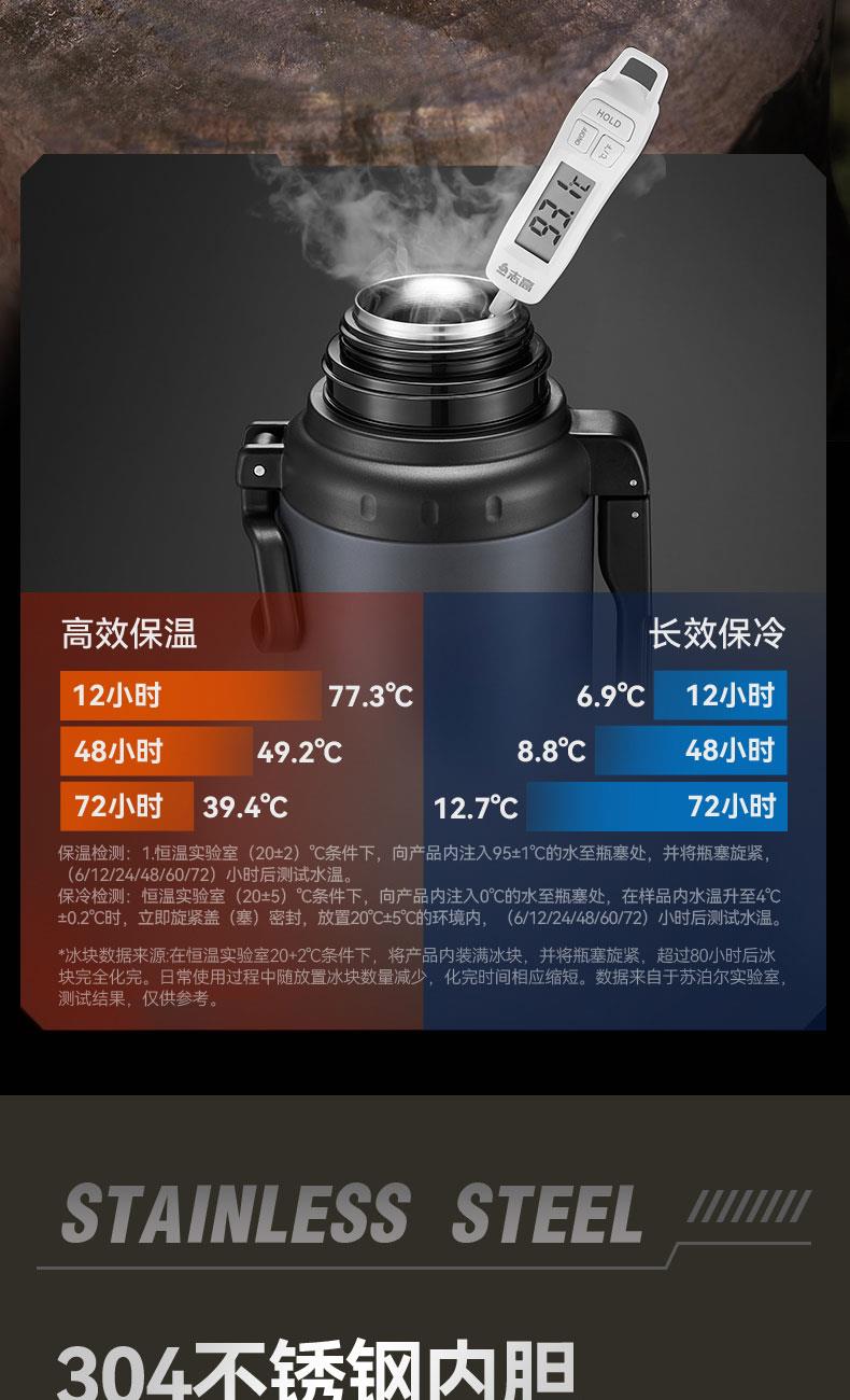 容量(L) 2.0L 材質(zhì) 內(nèi)膽304不銹鋼 規(guī)格參數(shù) 代發(fā)在庫顏色:高山綠/漫暮黑 商品毛重(kg):0.85 572*286*365 功能賣點 1、2L大容量,旅行、居家好幫手; 2、雙層鋼蓋,熱水入杯不燙手,飲用更安心; 3、強效保冷140小時+;保溫24小時+; 4、一杯雙用(直飲、杯蓋);