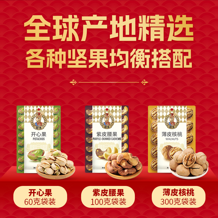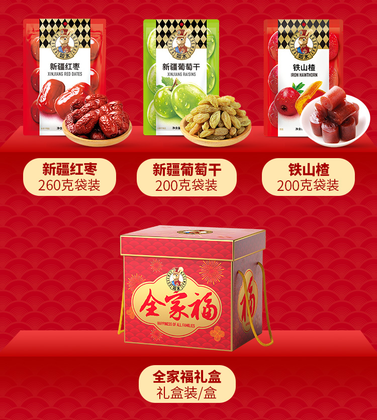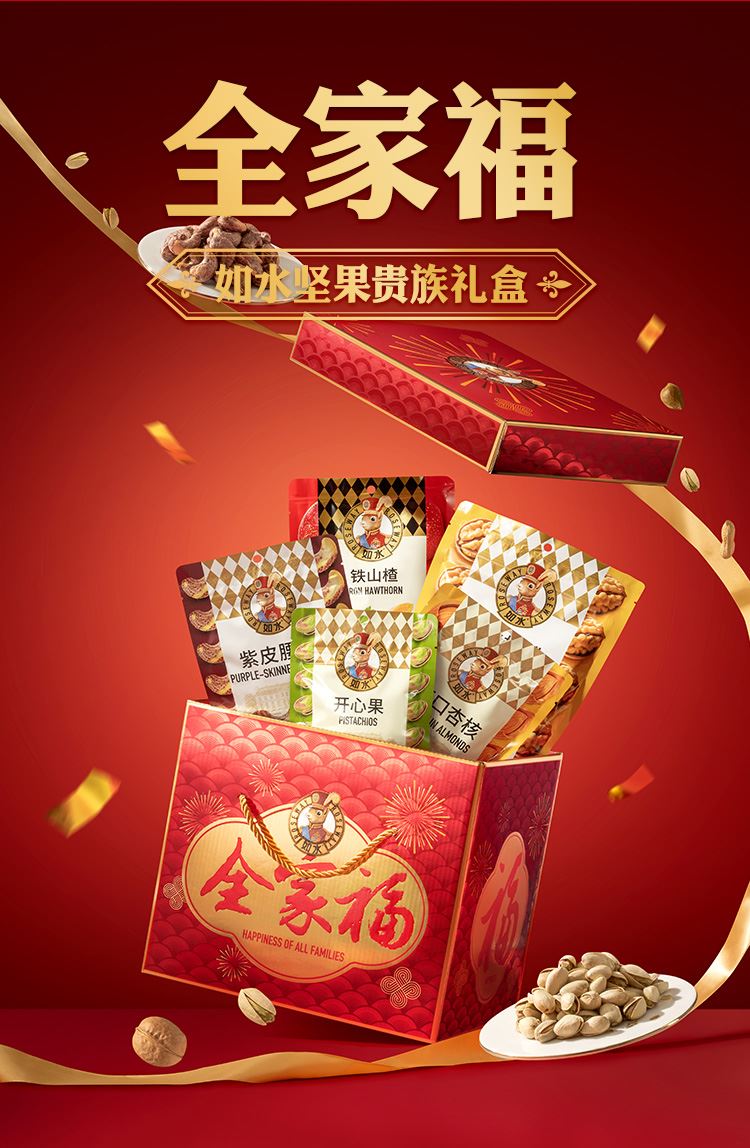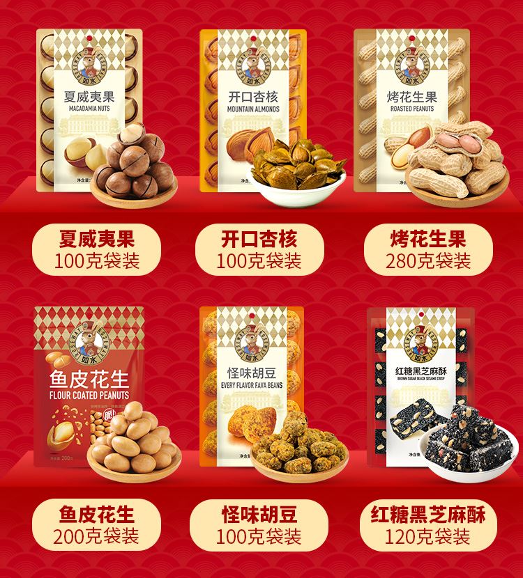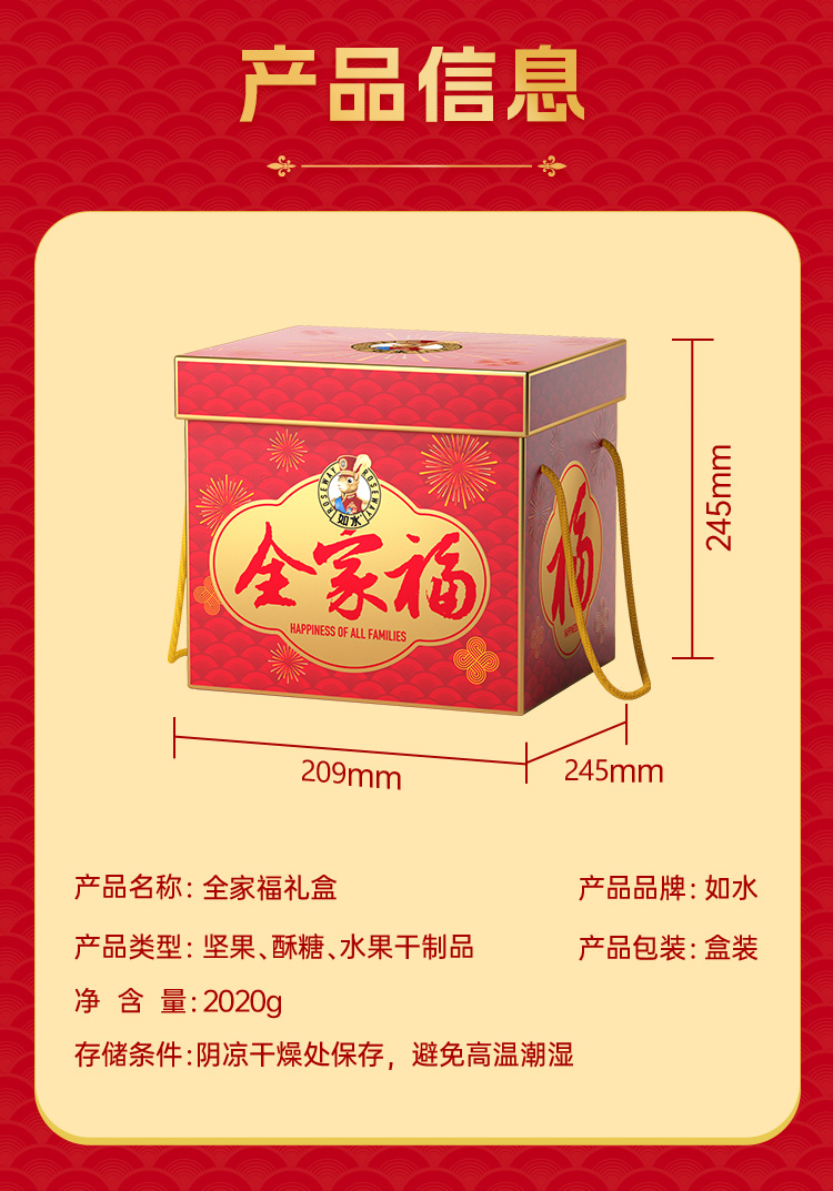 如水全家福禮盒 凈含量:2020g 如水開心果60g 如水紫皮腰果100g 如水薄皮核桃300g 如水夏威夷果100g 如水開口杏核100g 如水烤花生果280g 如水魚皮花生200g 如水怪味胡豆100g 如水紅糖黑芝麻酥120g 如水新疆紅棗260g 如水新疆葡萄干200g 如水鐵山楂200g